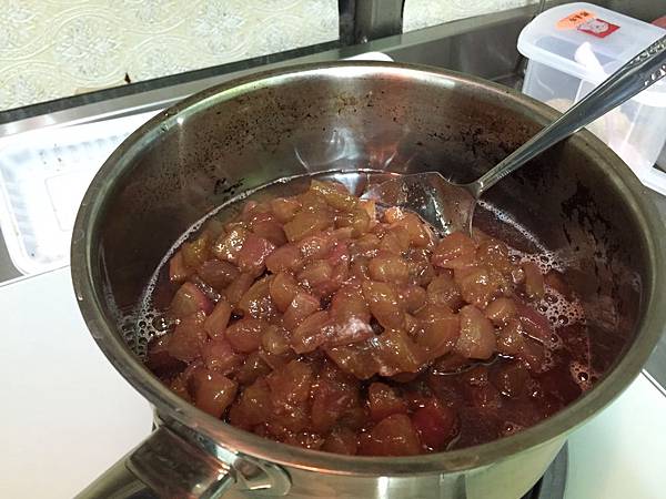 剛煮時根本不濃稠,可以轉中大火,等沸騰之後改為中小火-小火,開小火還是可以大部分時間看一看電視(看5-7分)再來翻動一次。