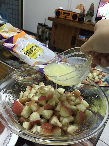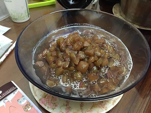 在此時因為我一直在電視與廚房奔波累了,所以索性開大火,一直攪一直攪,大概攪5-10分,就倒入玻璃大碗中,結束第一回合(因為有加檸檬汁,不建議放在不鏽鋼容器中過夜)。