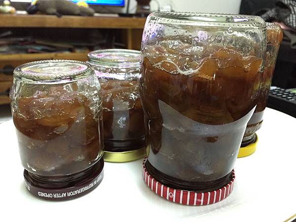 此時拿出已滅菌(必須放到水中煮沸過的玻璃瓶,並且烘乾,不可擦乾)的罐子,趁熱時裝進去。